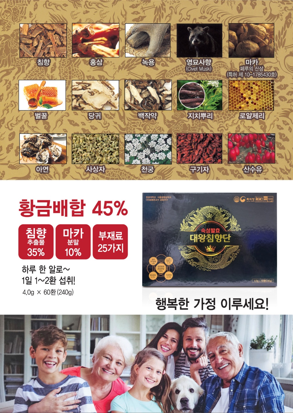 | 원산지 | 침향나무수지가침착된수간목분말(인도네시아산), 쌀겨(국산), 사양벌꿀(국산), 식물혼합분말[작약뿌리(국산), 참당귀뿌리 (국산)] |